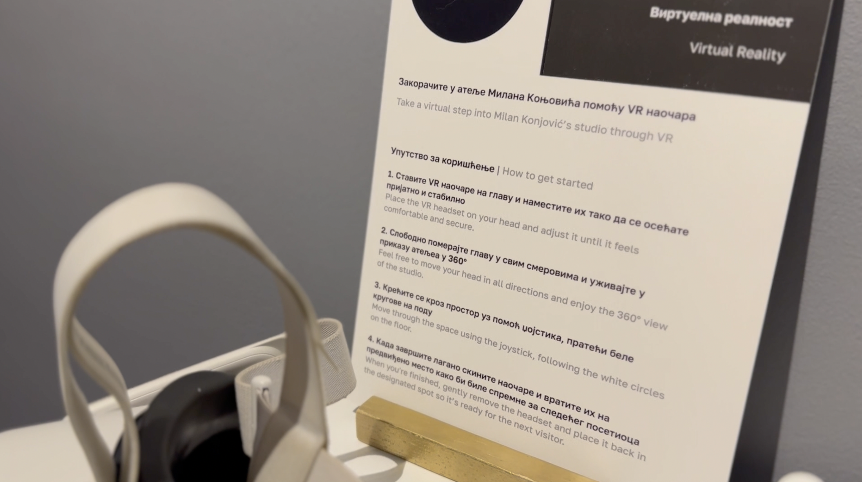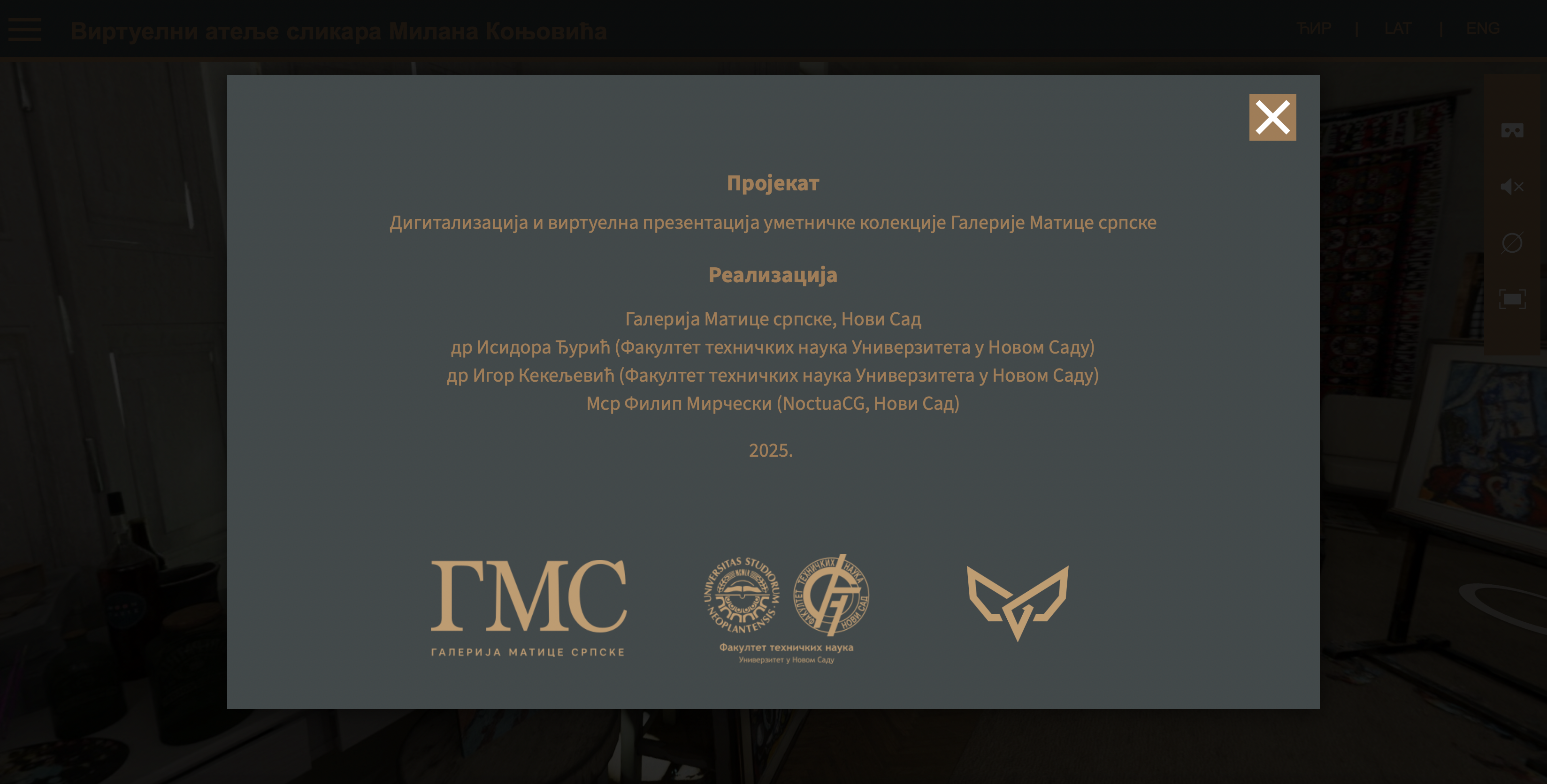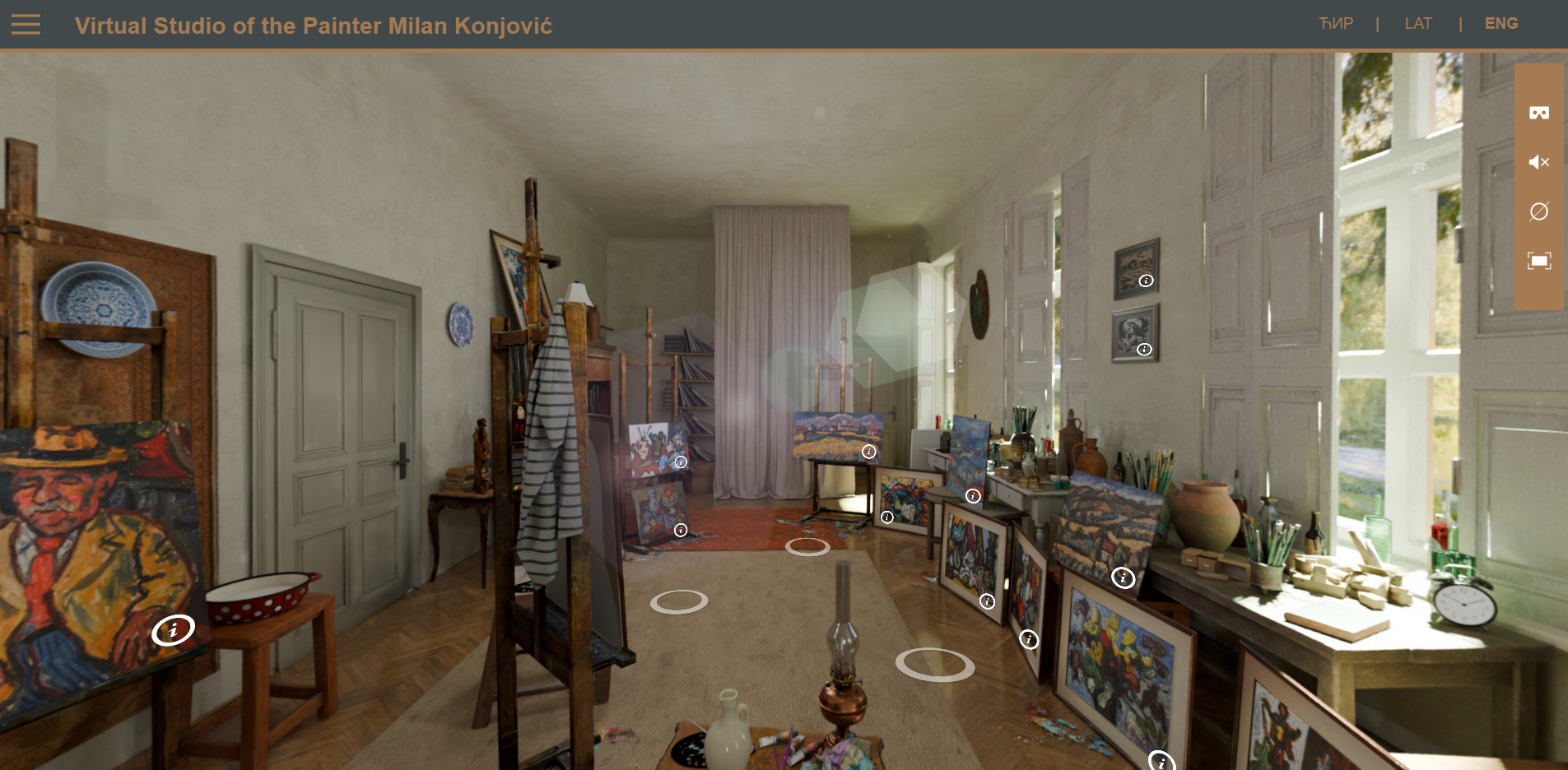 Virtuelna tura omogućava posetiocima slobodno kretanje u 360° prikazu, istraživanje enterijera rekonstruisanog ateljea i sagledavanje značajnih dela Milana Konjovića. Sinergija arhivskih izvora i savremenih tehnologija omogućava kreiranje interaktivnog i edukativnog digitalnog okruženja koje približava publici prostor i umetnička dela jednog od najvažnijih srpskih slikara 20. veka.